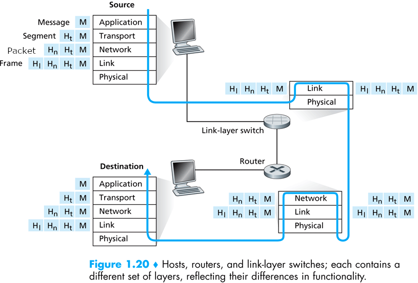Jednotlivé zariadenia na ceste si rozbalia rámec až po niektorú z nižších vrstiev za účelom správneho preposlania. Môžu tiež niektoré hlavičky nahradiť a nové rámce posielajú ďalej. Platí, že jednoduché switche rozbaľujú rámec iba po spojovú vrstvu a routre po sieťovú vrstvu. Transportná a aplikačná vrstva sa rozbaľuje až v cieľovom zariadení. Jedinou výnimkou je, že nejaké zariadenie na ceste je „v moci“ nejakého útočníka alebo špióna, ktorý môže čítať a meniť aj dáta pre najvyššie dve vrstvy.